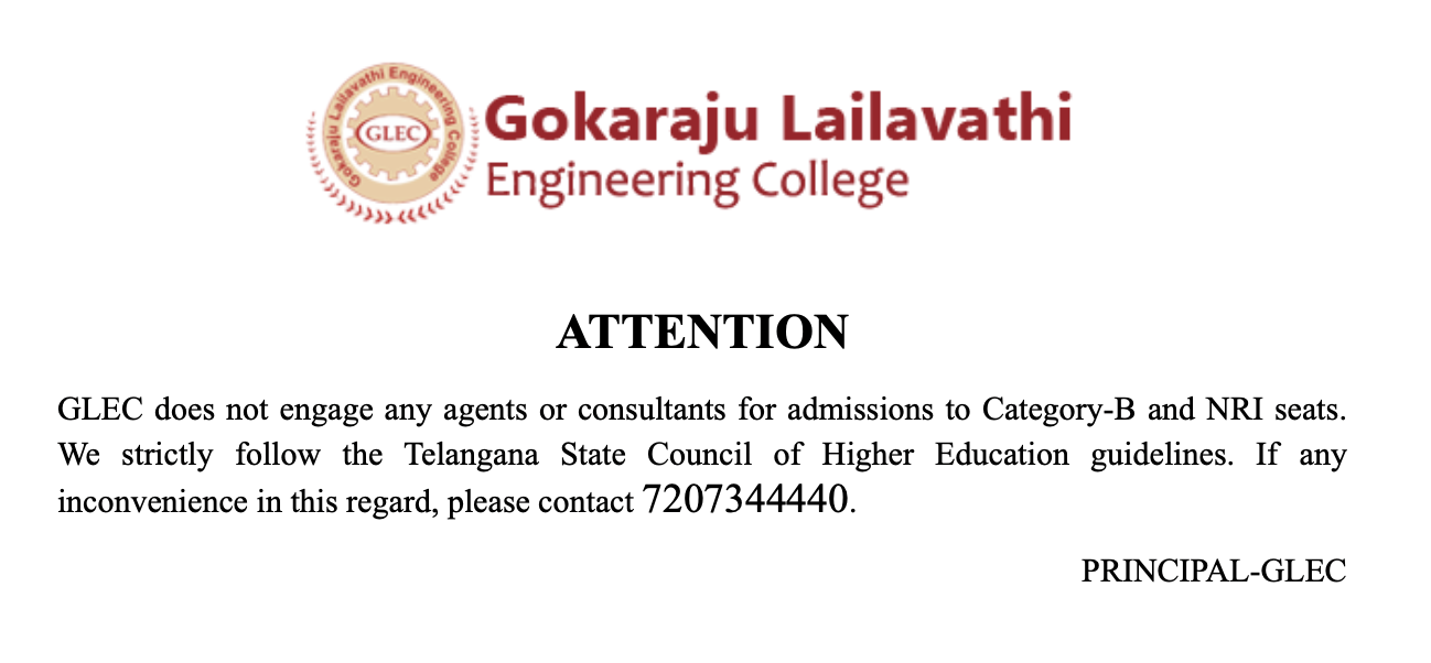 Gokaraju Lailavathi Engineering College (GLEC) [ previously Gokaraju Lailavathi Womens Engineering College (GLWEC) ] was established in 2021 by Dr. G. Gangaraju as a self-financed institution under the Gokaraju Rangaraju Educational Society, dedicated to promoting quality education. Approved by AICTE, New Delhi, and affiliated with Osmania University, Hyderabad, GLEC is recognized for its innovative teaching practices. The college benefits from the guidance of an experienced management committee comprising experts from various industries and academia. As a sister concern of GRIET, GLEC adopts its facilities and teaching-learning processes to ensure excellence in education.